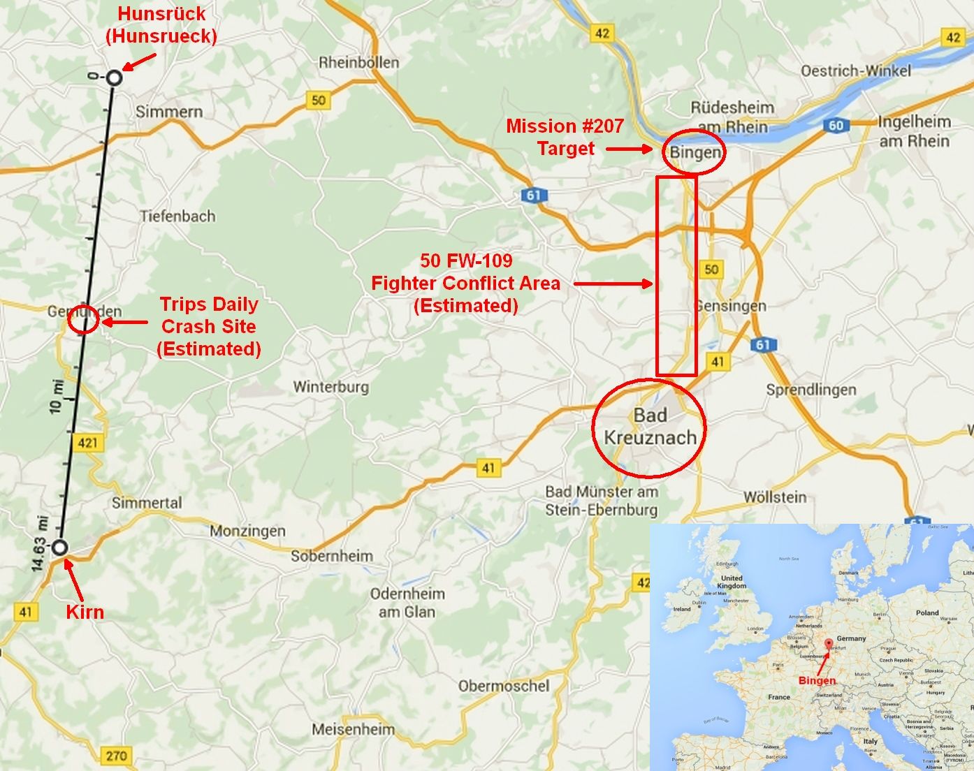 At the rallying turning point (RP) at about 1244 hours, the 577th was hit by an estimated 50 German Focke-Wulf 190, more commonly known as the FW-109, fighters between Bingen and Bad Kreuznach to the northeast. The fierce attacks lasted for around fifteen minutes with fighters attacking above and below — tail astern (“from the back” or “behind”). The attack was so intense that it was difficult to work out what happened. Six of the 577th crews were lost in this short period. There were only 19 survivors out of the 54 men in the planes that went down. For the families of those who were lost there would be little information about how they met their end. What information did emerge would be scanty, and a long time coming.