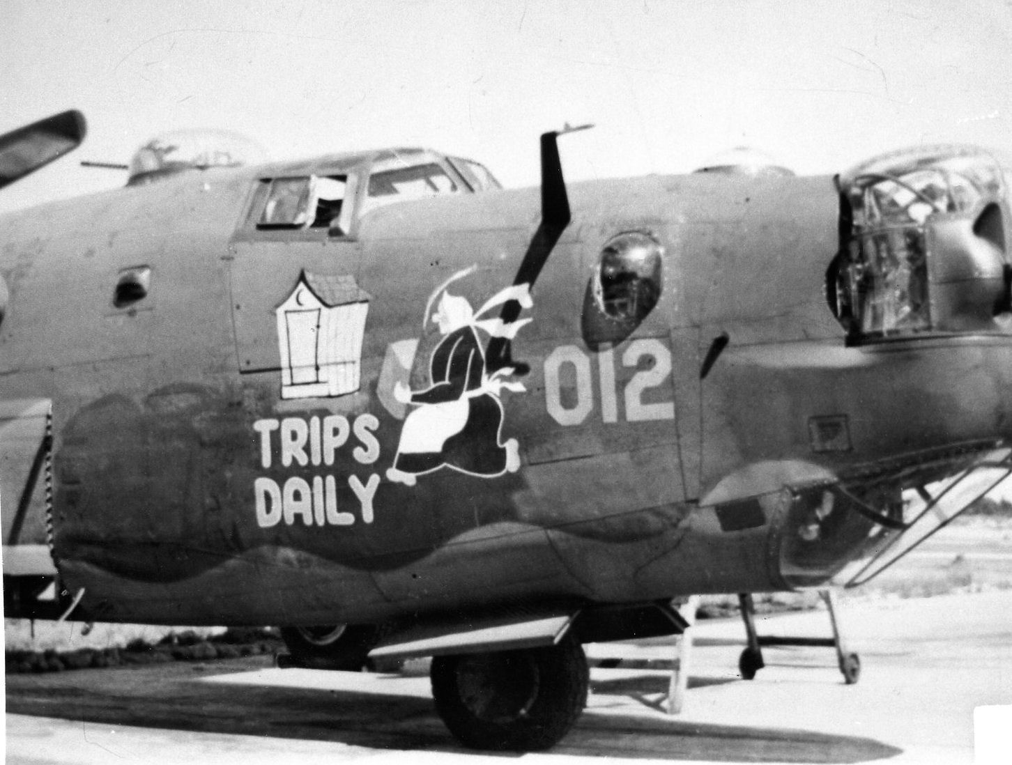 Trips Daily and crew. You can see that the Trips Daily had completed 50 missions as represented by the 50 bombs painted above the nose art. Charles was part of the Trips Daily crew starting with mission 45.
