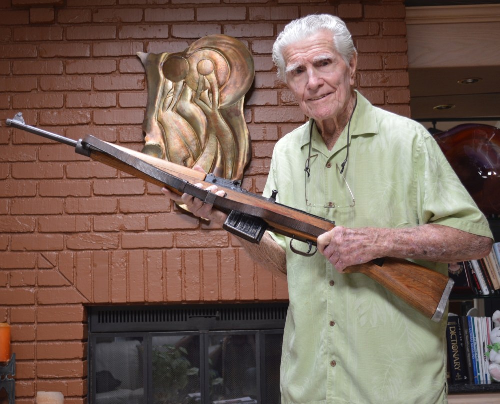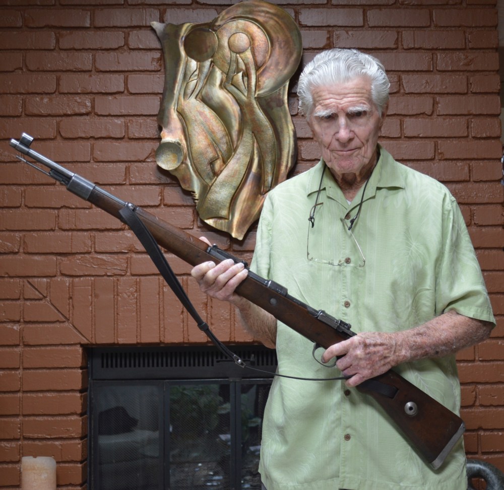 April 2, 2017: Charles Pedrotta holding my byf42 Karabiner 98 kurz (K98k), serial number 2898y. This is the type of rifle that the guards at Stalag Luft 1 would have been using.