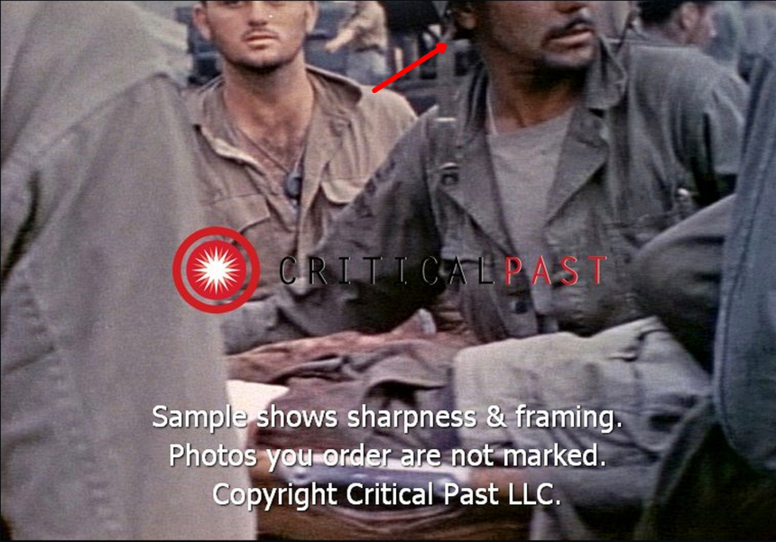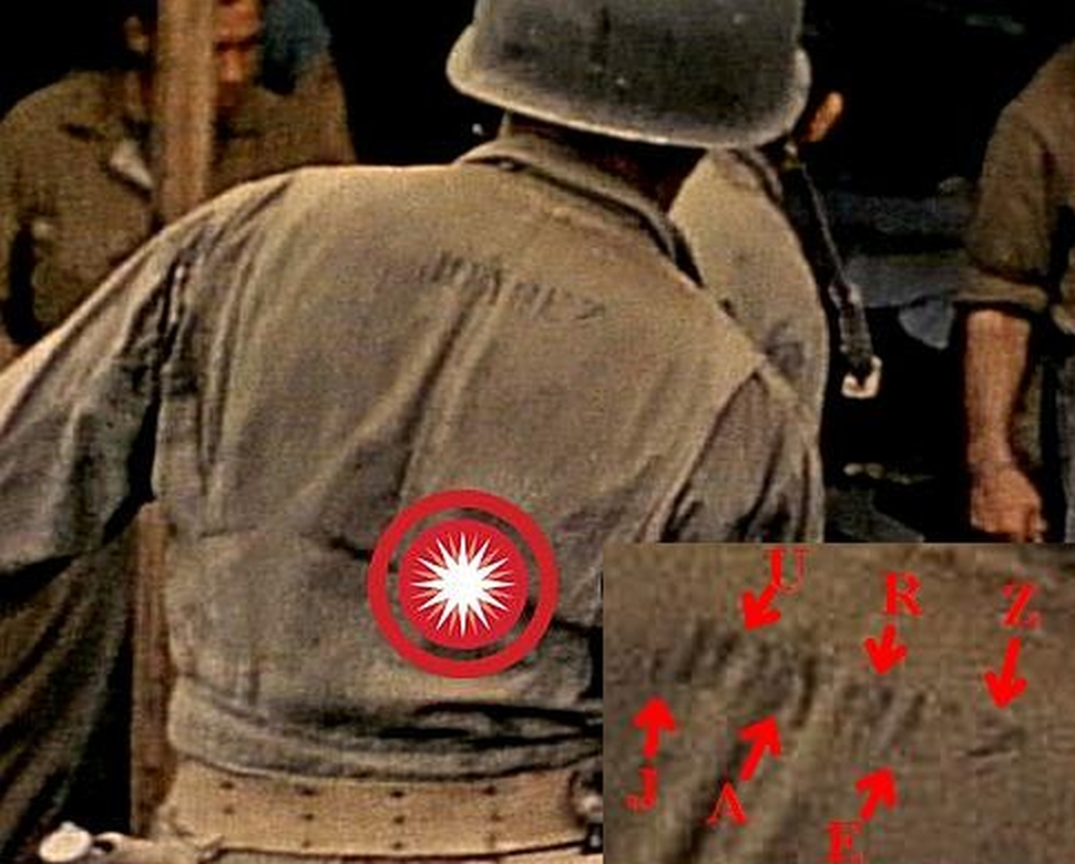 After very close examination using an imaging application to vary contrast, gamma, saturation and sharpness, the writing on the back of the soldier’s shirt is clearly “JUAREZ”.
