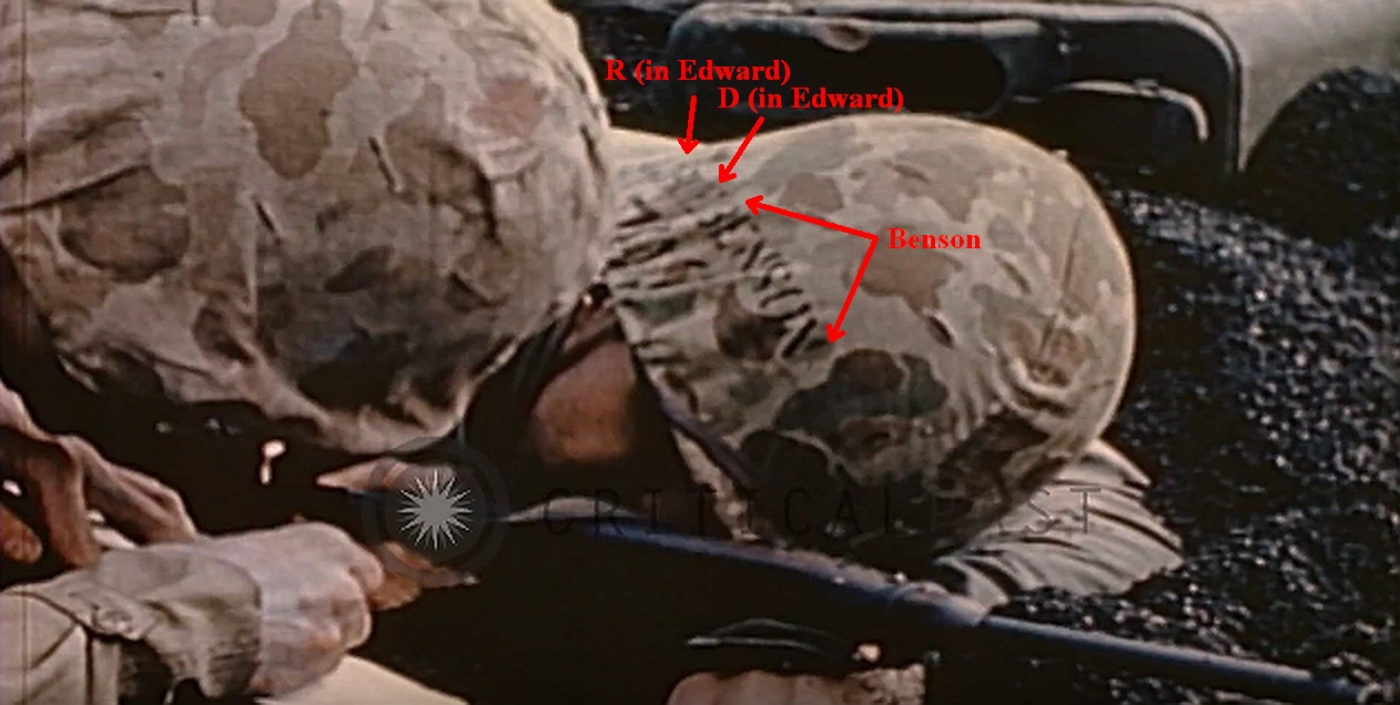 2) The last name on the helmet is clearly Benson AND, according to The Spearhead (page 194), there was only one soldier with the last name of Benson in the 5th Marine Division that was wounded in action (WIA) – Edward M. Benson.