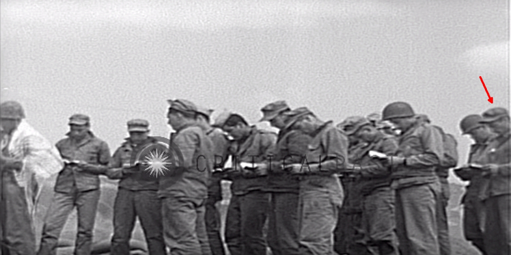 2) Although the quality of the video makes it difficult to see, the visible writing on the bill of the soldier’s cap is “AN” and “Gertz” (sideways), as seen in the descriptive screenshots below, AND, according to the January 1945 Muster Roll (Roll 0916), there was only one soldier in the 4th Marine Division on Iwo Jima with a last name of Gertz – Norman Gertz.
