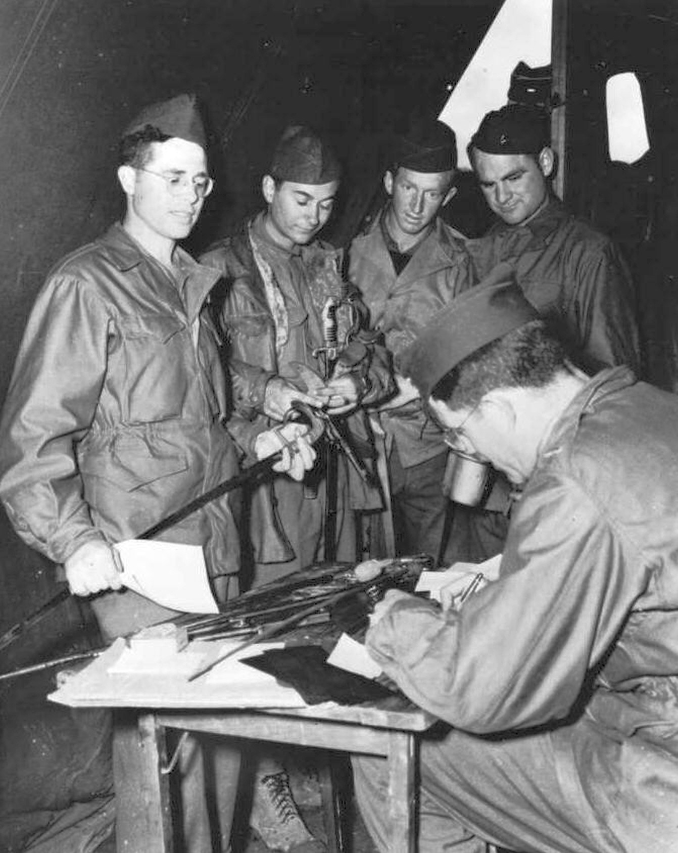 Registration of souvenirs inside the “Booty Tent” at Camp Lucky Strike. The 6th soldier back in the previous photo is registering his souvenir. The soldier in the background is the one holding a K98 in the previous photo.