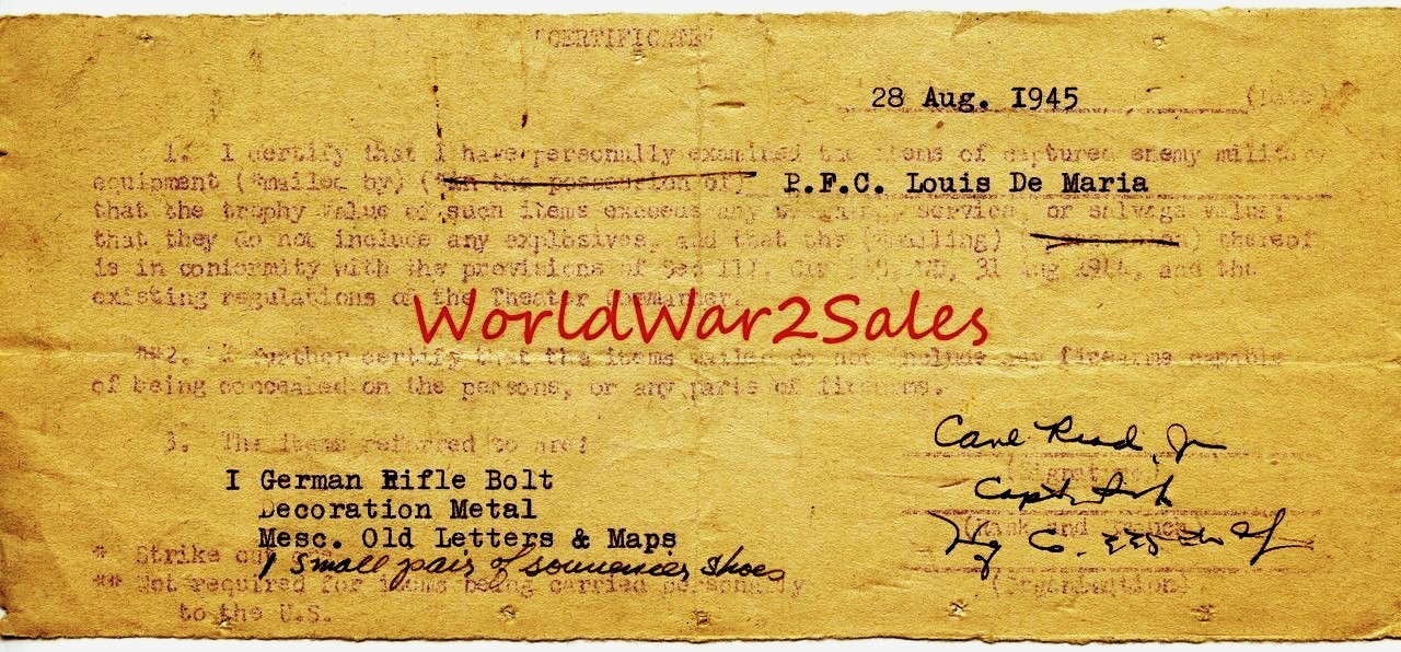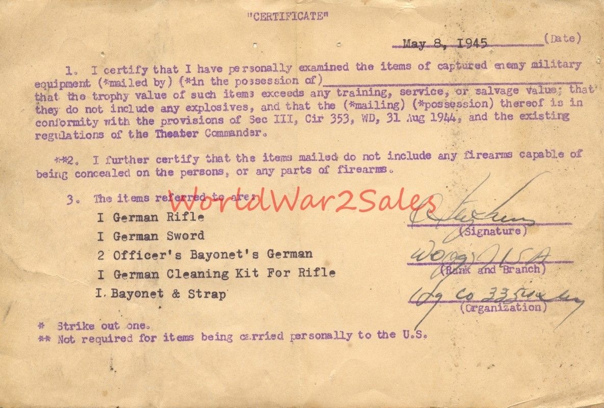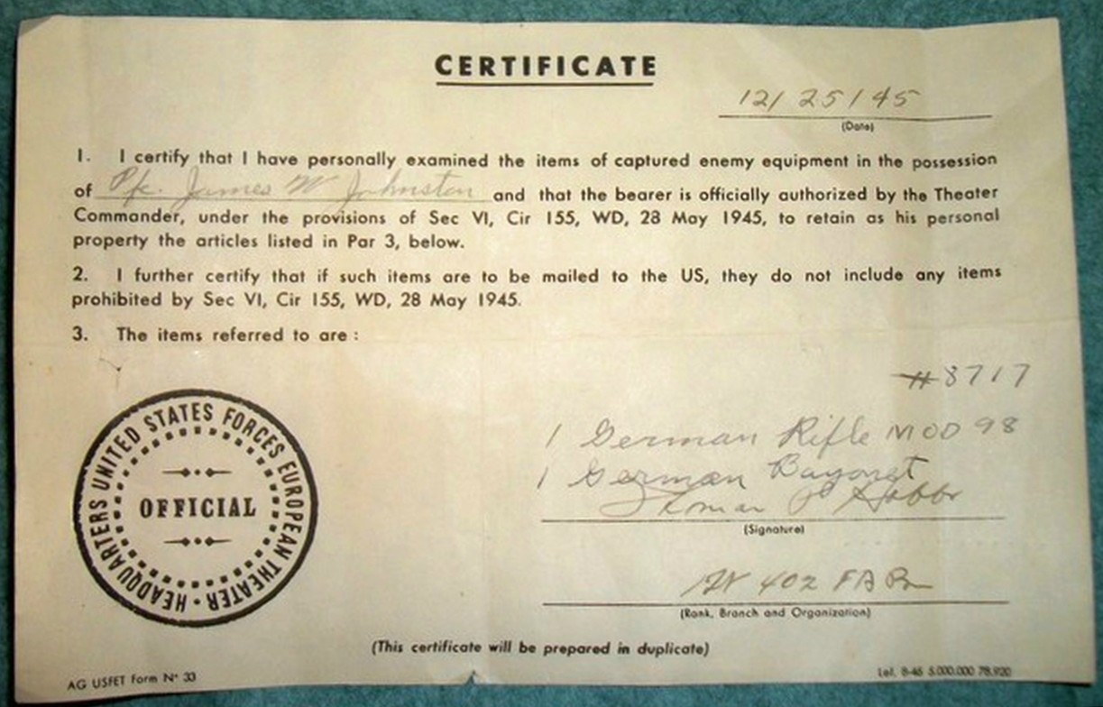 See the National Firearms Owners Association (NFAOA) document regarding World War II War Trophy firearm records and another registration certificate example.
